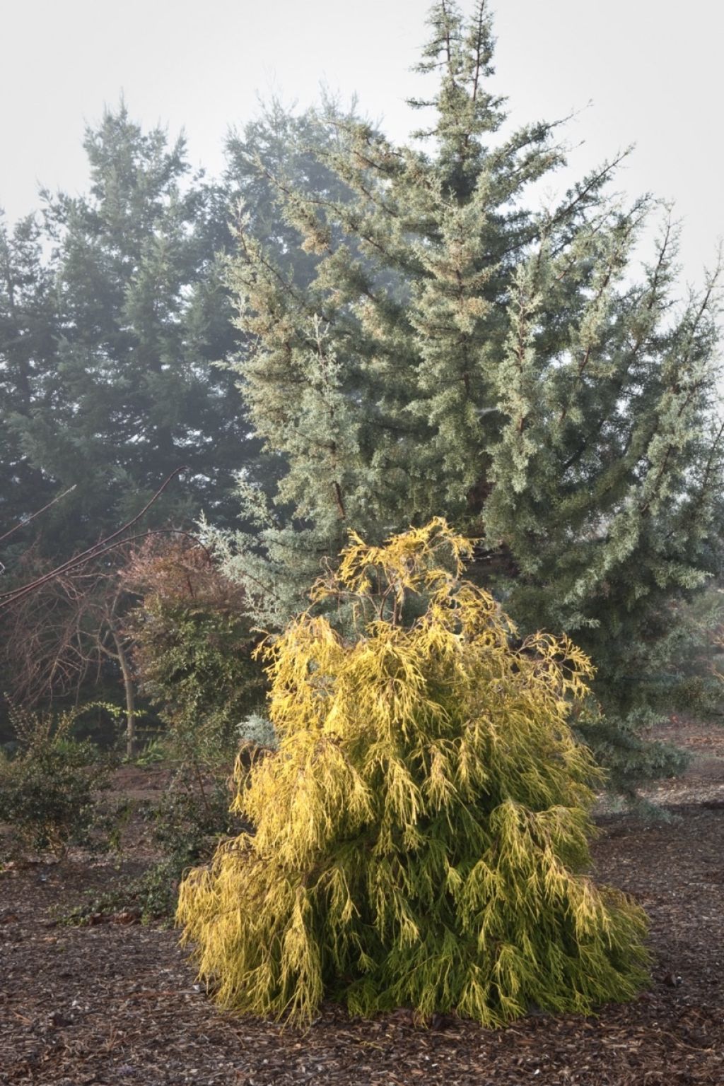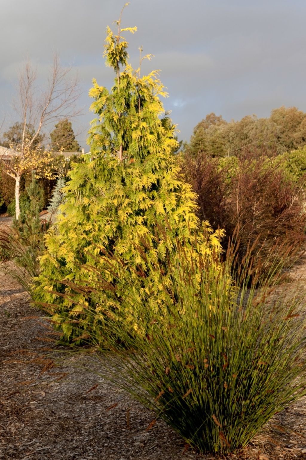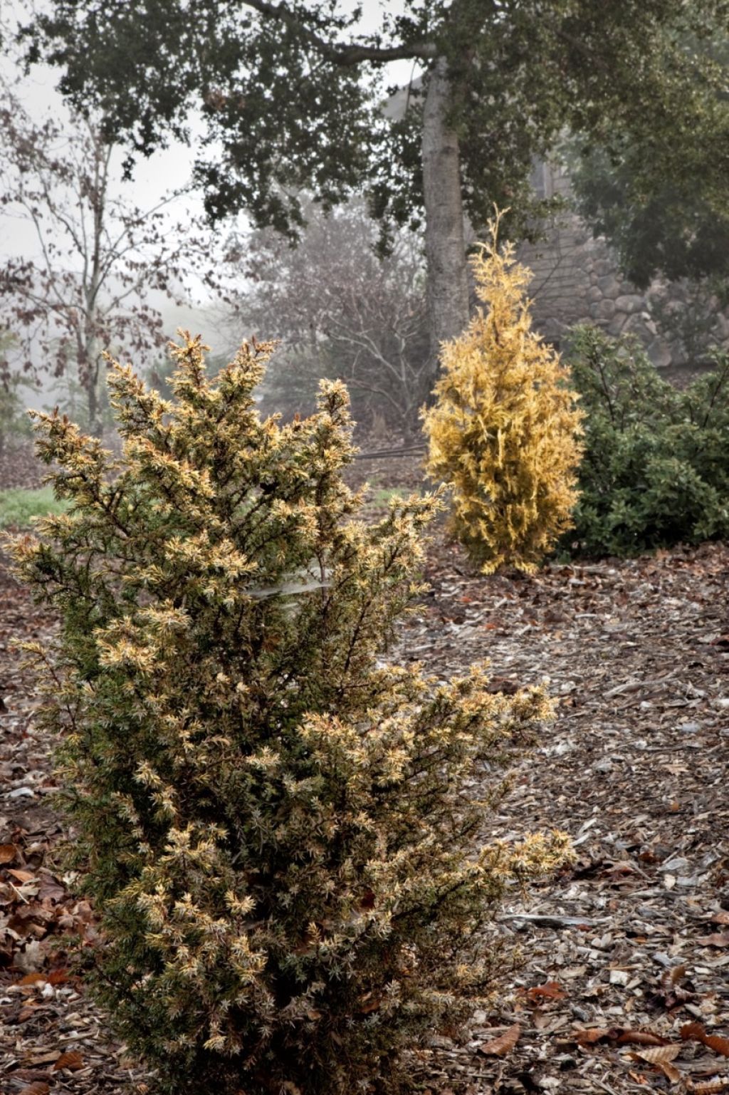 Most golden evergreens are conifers, and there is a seemingly endless array of choices. Those that follow are selections that we have grown and know well; there are many, many others, so use these as suggestions and explore the available offerings in your area. We have tried to include a little something for everyone: large and small, upright and weeping, bold and demure. Many of our choices will grow in zones with much colder winters than our Zone 9b.