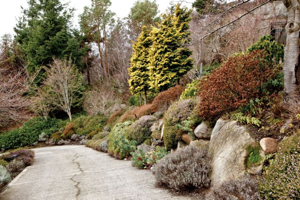The most asked-about plant in the garden has to be the Chamaecyparis lawsoniana ‘Golden King’, a bicolor specimen whose dark bluish green foliage is frosted with deep, bold yellow. While this plant can get quite large eventually, that isn’t likely to trouble anyone who plants it, as it is extremely slow growing. It can also be pruned gently.