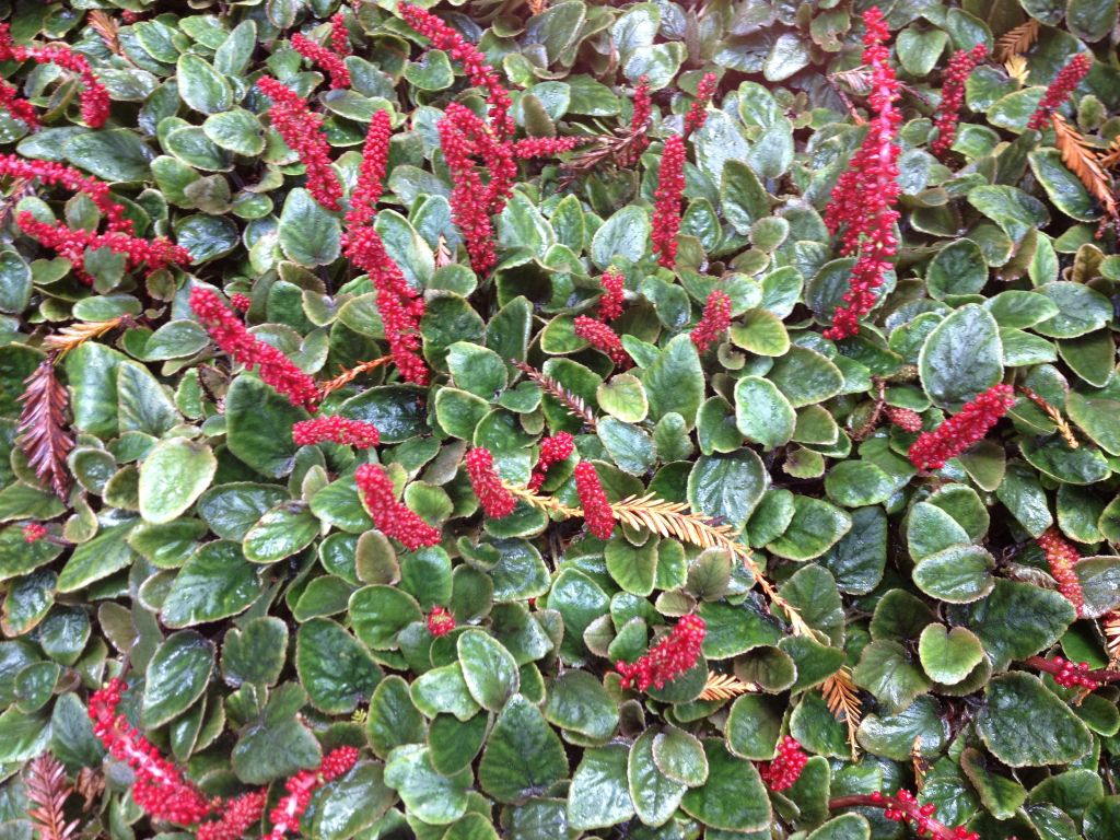 We admit that the red from Gunnera prorepens is from its flowers, not its leaves, but we use it for its chocolatey leaves and consider the flowers a bonus.