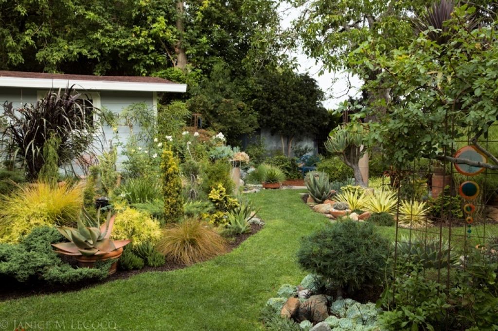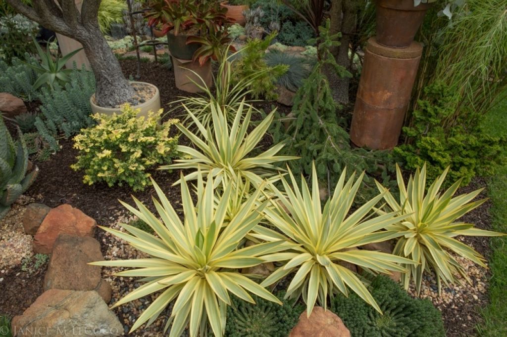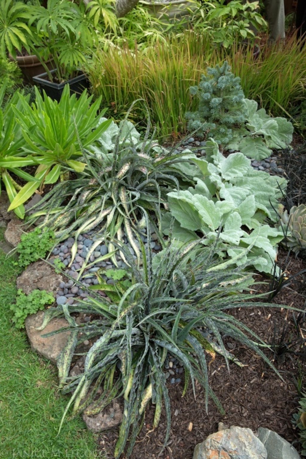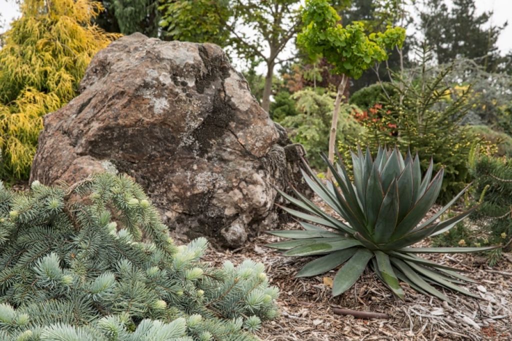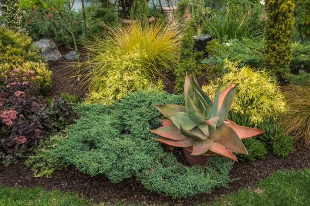Secondly, many conifers and woody plants can do with less, or at least less frequent, water than many perennials. The fussiest succulents--those that are frost-tender or require extremely well-drained soil--can be planted in containers which both allow for removal to shelter during winter and provide excellent drainage. However, it is perfectly possible to grow succulents near other plants simply by creating a mound made up of 1/2 soil and 1/2 a gritty substance such as lava pebbles. If the succulent is planted high up in such a mixture, it can receive the same amount and frequency of water as the other plants, and it will drain much more quickly.