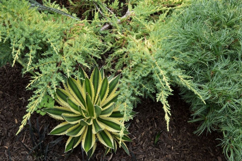 Aloe striata has coral leaf margins and in shade, rosettes of broad, flat, bluish-green leaves. The leaves turn ruddy pink in full sun and make for a beautifully two-toned plant. In the photo above, the blue-green of the Aloe is echoed by the juniper, again with a marvelous textural contrast. The Aloe is hardy to only 20 degrees, so in this garden is planted in a container, which may be moved to a protected area when necessary.