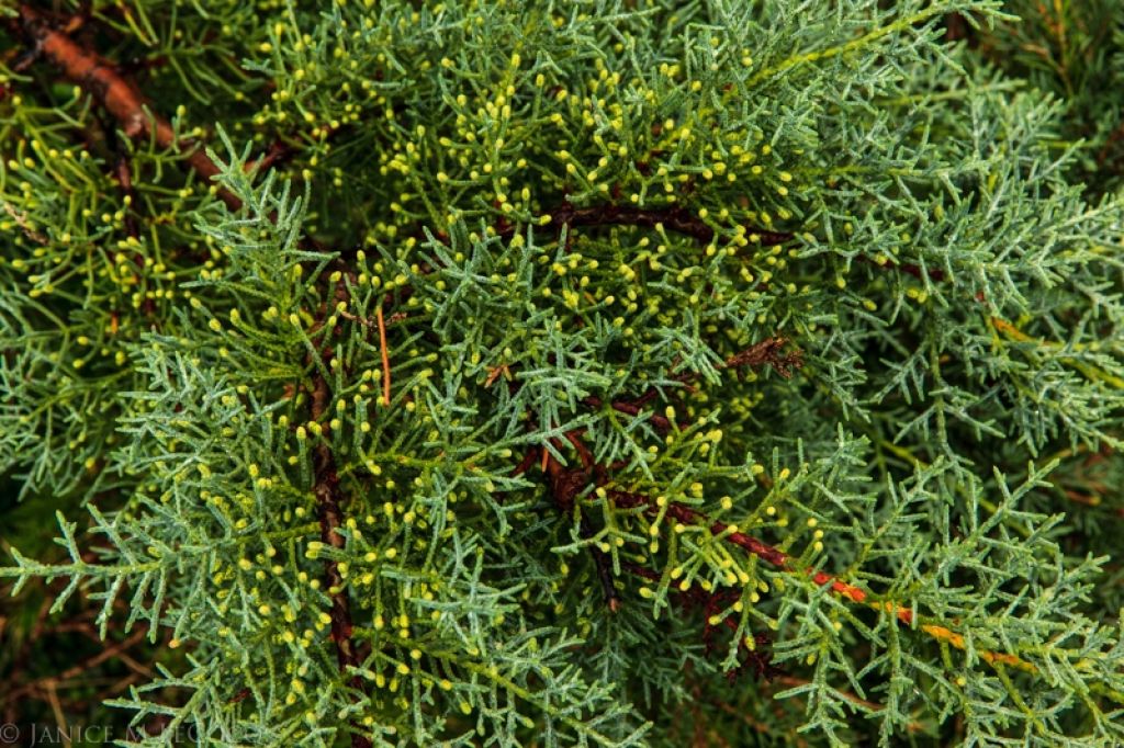 Similarly, without help from others, ‘Raywood’s Weeping’ Arizona cypress provides a virtual explosion of texture, with immature pollen cones lighting up the tips of the branchlets.