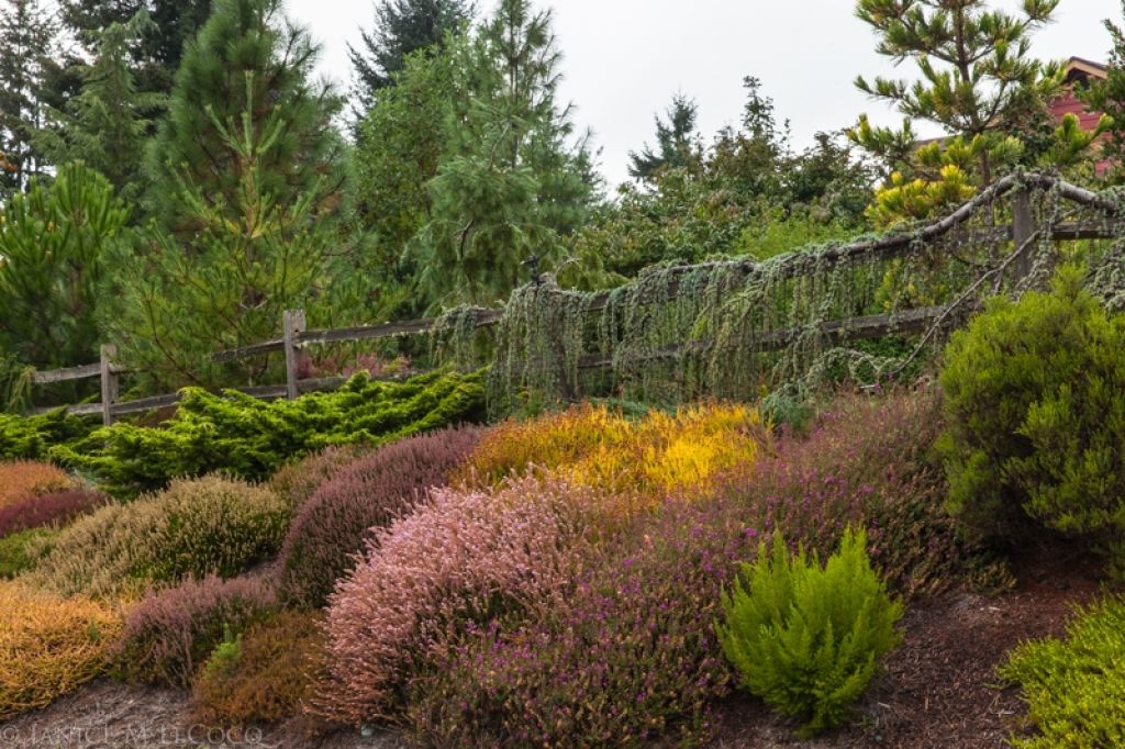 The colors of the heathers are striking and the fact that they (and the cedar) share the same fine texture does not diminish the loveliness of the planting. However, if you remove the color, you flatten the effect and reduce the impact.