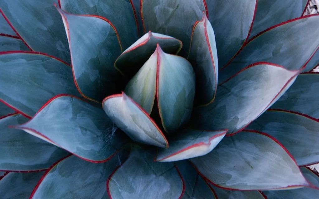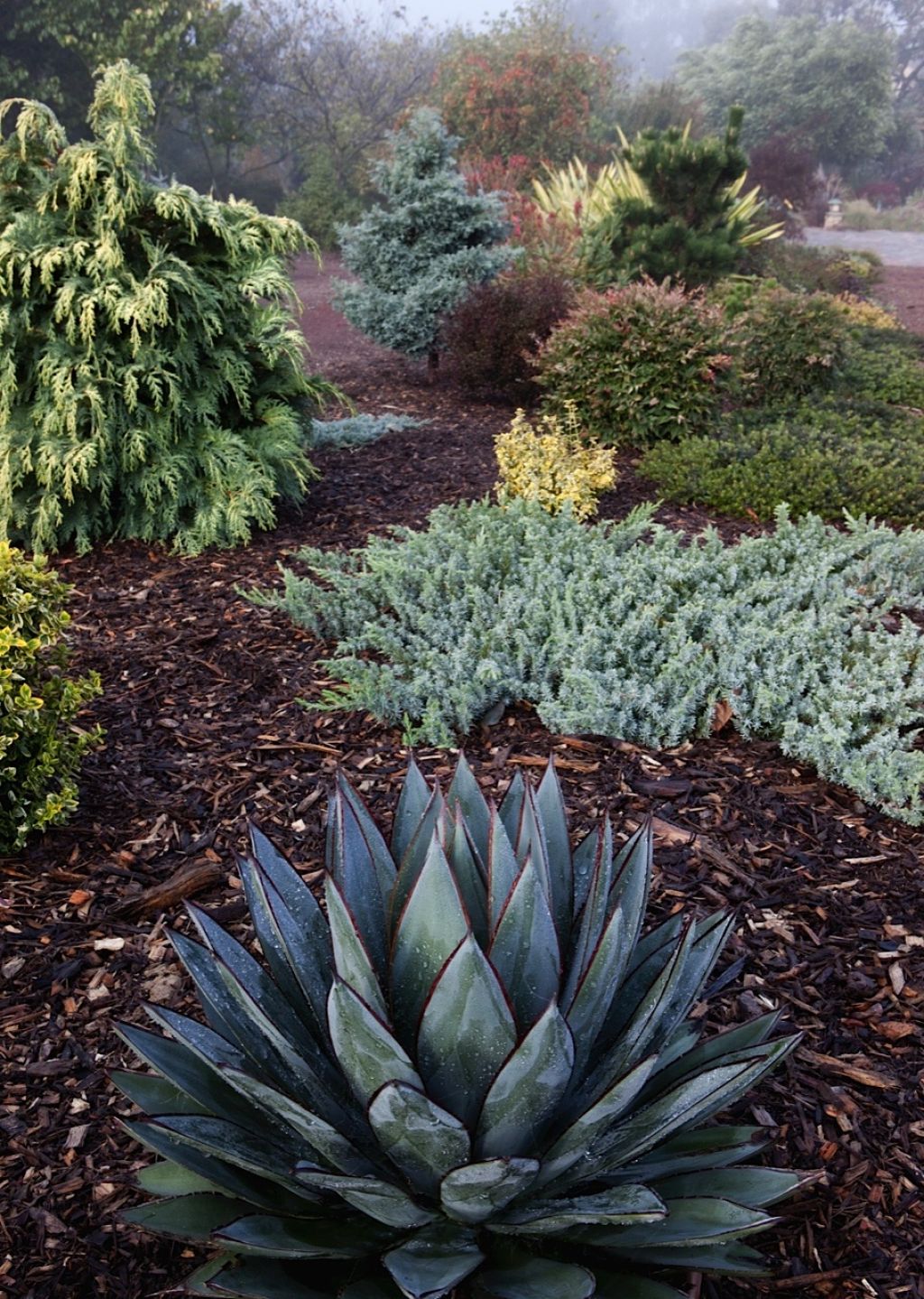4. We love our succulents, and rather than relegate them to their own beds, we prefer to choose larger varieties and interplant them into the rest of the garden. Agave x ‘Blue Glow’ (Zone 8-11) is our very favorite. In the world of Agave, this counts as a small plant, but as you can see, it holds its own amongst many reasonably large shrubs. ‘Blue Glow’ provides both stunning structure and color and the maroon margins are complemented with maroon-leaved plants such as Berberis, Cotinus or certain succulents. Its water needs are lower than the nearby shrubs, which we take care of by mixing a goodly dose of lava rock into the soil around it and planting it up about 2-3″. It’s on the same irrigation as the rest of the garden. This Agave will ‘pup’, or produce smaller plants around its base. The leaf spines are extremely sharp; if you have young children or dogs it is advisable to snip them off with a scissors. It’s hard to imagine a plant that provides this much oomph with virtually no maintenance. looks great up close, too: