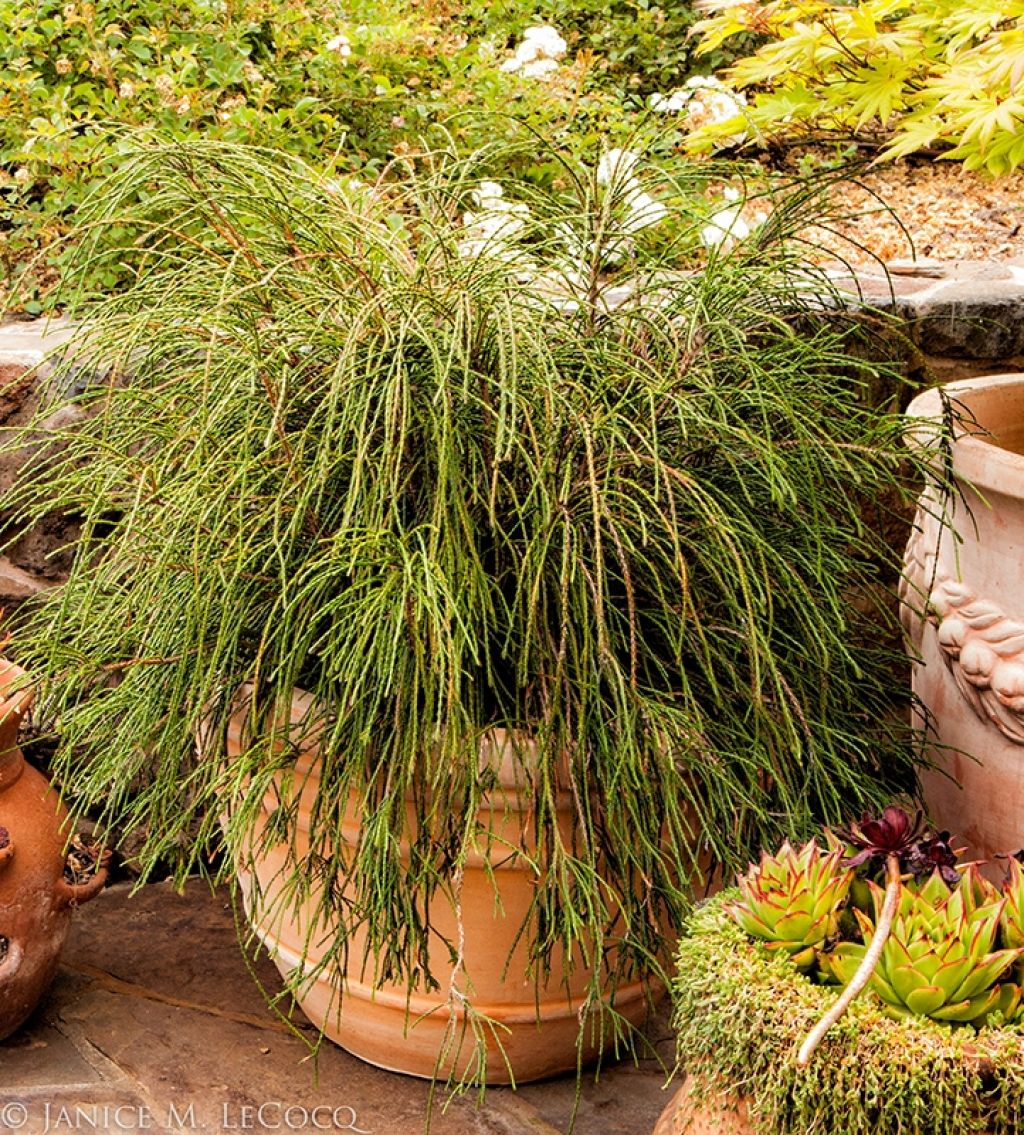 7. If you like the look of ornamental grasses but hate the mess and upkeep, Thuja plicata ‘Whipcord’ (Zones 6-9) is your plant. With the fountain-like habit of a large ornamental grass and the no-nonsense low-care attributes of a conifer (which it is!), it is the perfect marriage of style and simplicity. The dark green foliage bronzes in winter, complementing the rusty brown stems. Its mounding, weeping habit is graceful and soft and its pendulous branches move in the breeze. We often purchase special, highly desirable plants and find ourselves walking around the garden, trying this spot or that, never finding quite the right one. We can always find a spot for ‘Whipcord’! It seems to fit in anywhere. ‘Whipcord’ is slow growing but over time will form a 4-5′ shrub that is almost as wide. Easy pruning keeps it much smaller, much longer.