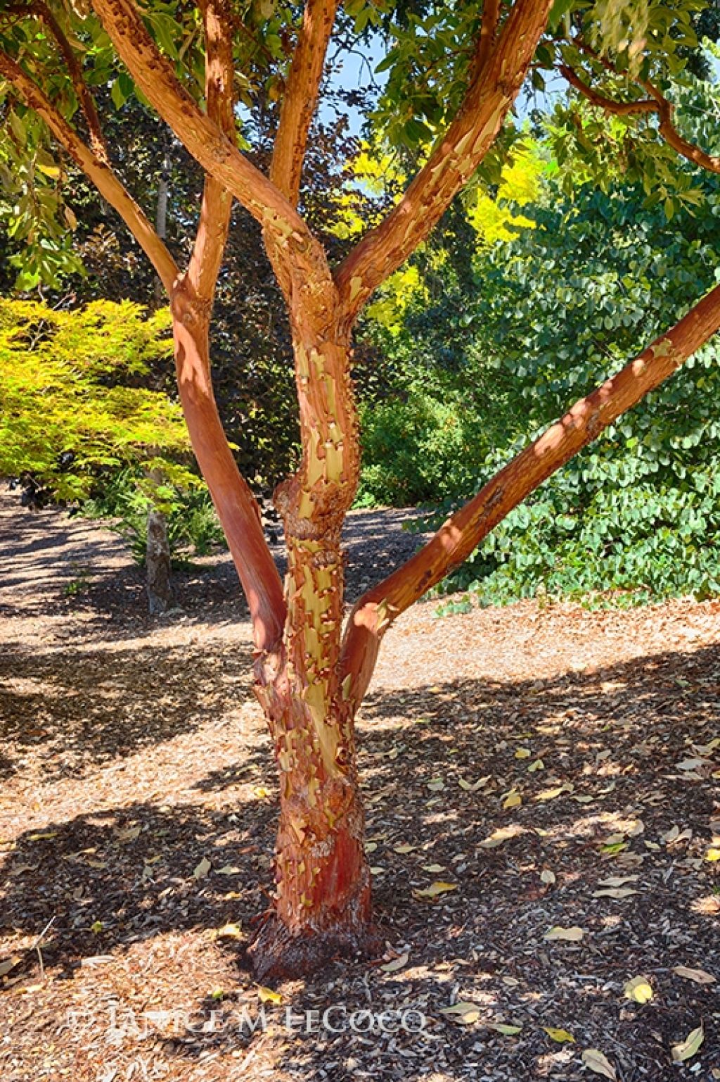 The ancestry of ‘Marina’ is unknown; it was first observed at a nursery in San Francisco’s Marina District and it is likely a hybrid between two species of Arbutus. ‘Marina’ flowers year-round, with peak bloom in spring and fall, and the fruit persist from yellow immature to red mature fruit, for a very decorative effect. The leaves flush bronze, later maturing to deep green. There is not one part of this tree that is not showy! ‘Marina’ grows slowly but will eventually become a full-sized tree, so site it accordingly.
