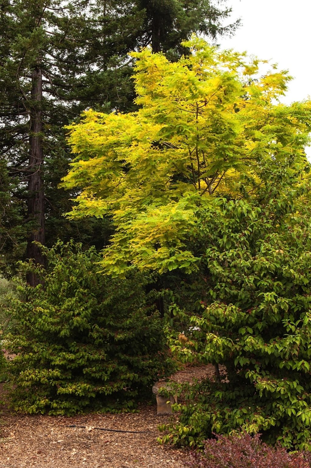 10. We end this entry with a controversial choice: Robinia pseudoacacia ‘Frisia’. ‘Frisia’ is a large, fast-growing tree that not all gardens can accommodate. Some say it self-sows almost to the point of invasiveness; we have never found it so here, with our drip irrigation and sumptuous mulching. Others complain about the brittle branches–again, they have never presented a problem for us. We do some pruning to tidy it up but other than that we leave it alone. The key to making this tree work in your garden is having enough space for a large tree, and preferably siting it against a backdrop of darker foliage, such as the redwoods in the photo. Some do regularly prune it hard and use it as a large shrub, but we prefer the graceful canopy and the dappled shade that it creates. The light underneath is golden and bright. ‘Frisia’ only gets more beautiful in autumn, when its chartreuse foliage softens to a creamy golden yellow. It rivals the Ginkgos for its beacon-like effect as the days shorten at year end.