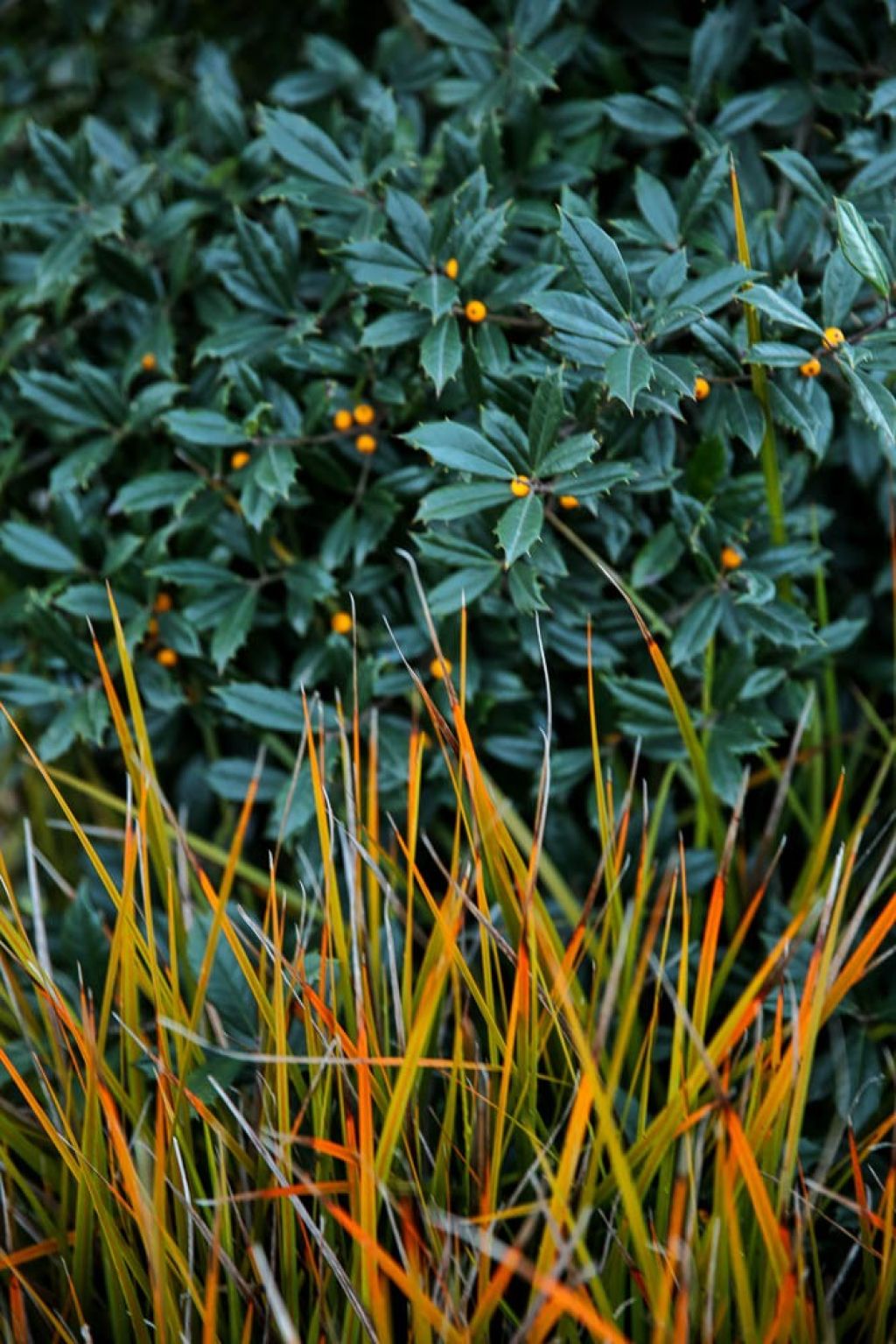 So what about jewels? We found that Ilex x attenuata ‘Longwood Gold’ has lovely orange beadlike berries. This natural hybrid of two native North American hollies is rarely seen in cultivation and we don’t know why. It makes a perfect pairing with orange libertia.