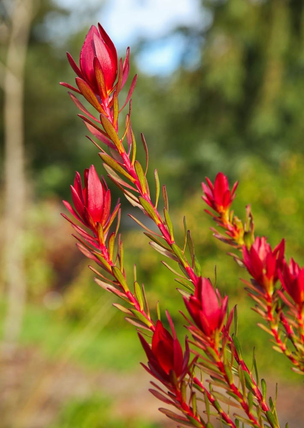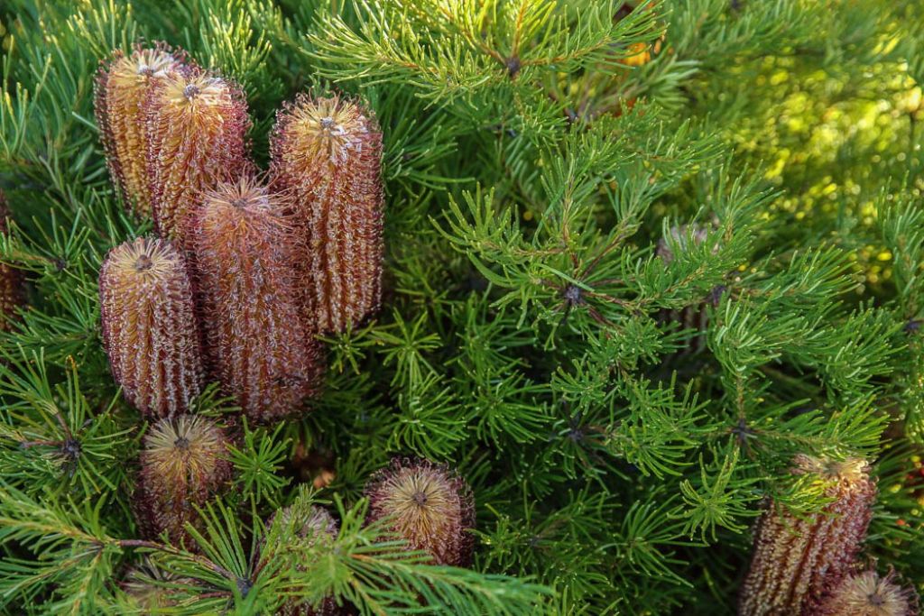 While we’re enjoying the finery, we thought we’d do our hair. Banksia spinulosa ‘Schnapper Point’, or koala blooms banksia, has candle-like (or curler-like!) blossoms that stick out through the foliage. This year it was extremely floriferous so we can cover ourselves in curls.