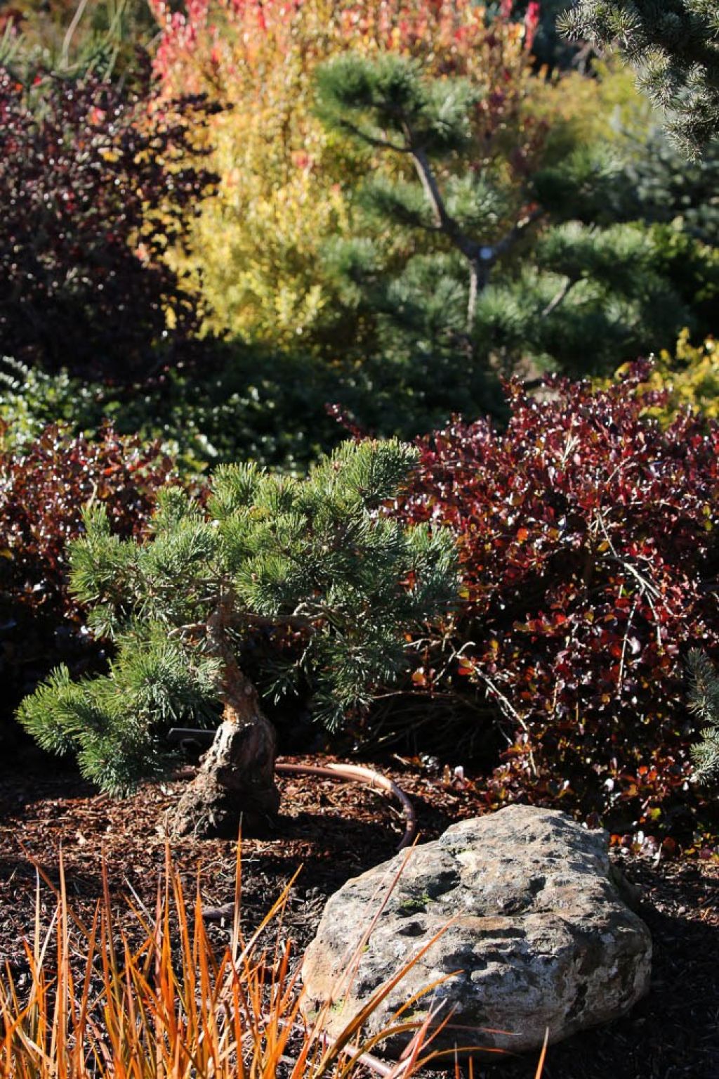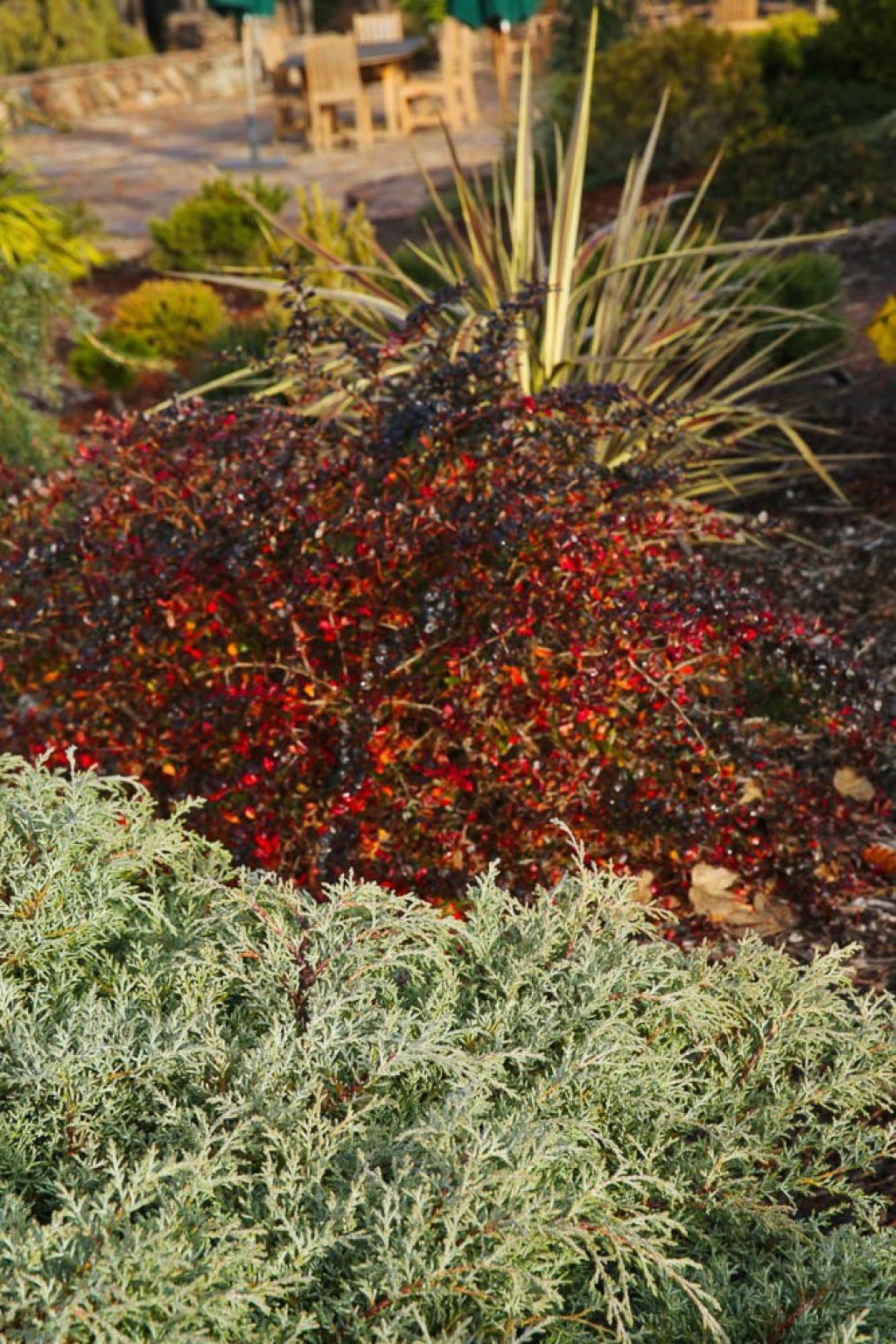 The shiny purple-burgundy foliage of the mirror plant, Coprosma, would certainly do the job. ‘Red Jewel’ barberry’s brighter, glossy foliage also caught our eye: