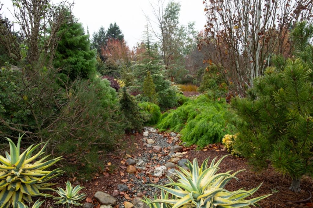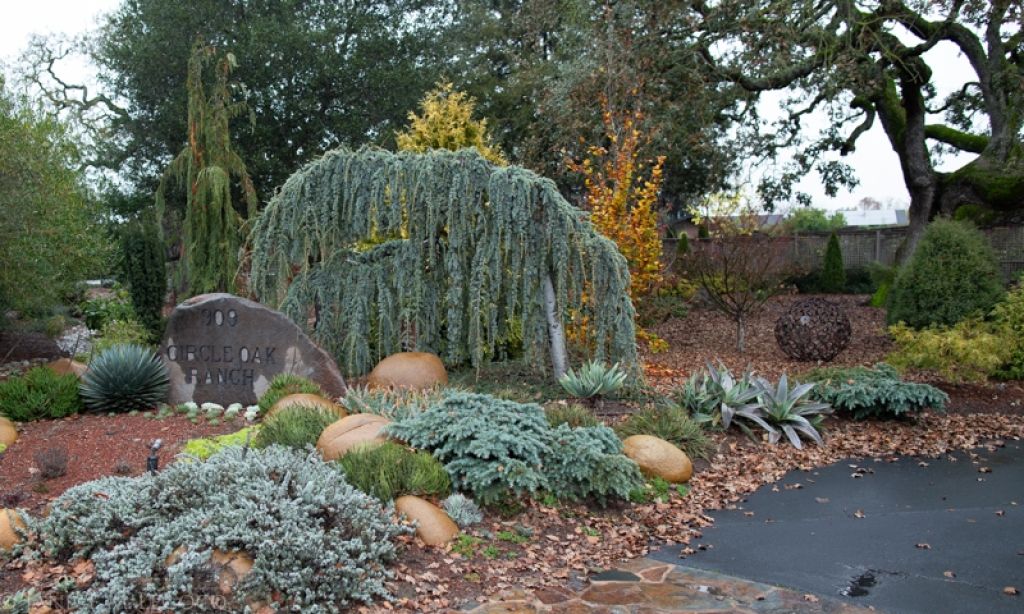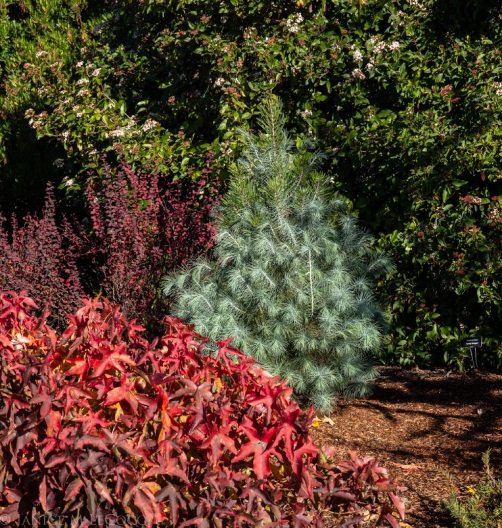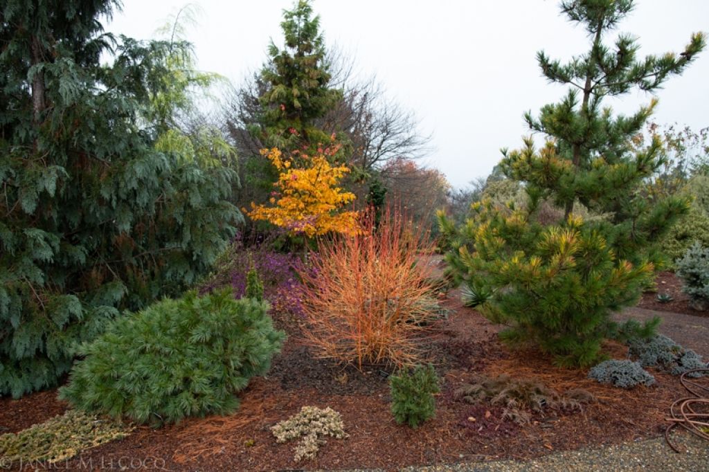 Some of the winter colors come from the deciduous trees that are late to turn and even later to drop their leaves. Both the barberry (Zone 5) and sweetgum (Zone 5) above hold their leaves well into December in this zone, and by planting them near a blue-needled conifer, in this case big-cone pinyon pine (Zone 9), we get the dramatic effect provided by complementary colors (color wheel-opposites).