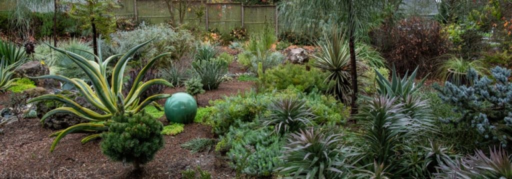 The glazed ball dominates the Echeveria, but when we step back we see it in context with the larger plants. It still provides textural and structural contrast, but the ‘Stained Glass’ octopus agave (Zone 9) and the clump of ‘Blue Boy’ yucca (Zone 7) are hard to compete with!