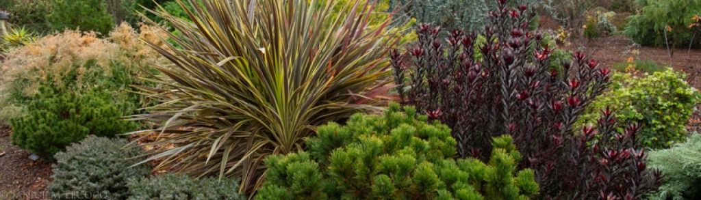 Weak winter sun creates pleasing shadows and highlights, unlike summer’s harsh overhead glare. The Monterey cypress cultivar on the left, ‘Greenstead Magnificent’ shows off its sea-green color and tweedy texture much better in winter than summer, and the Cordyline’s delicate straps are teased and separated by the weak light. Cold also brings out its pink highlights.