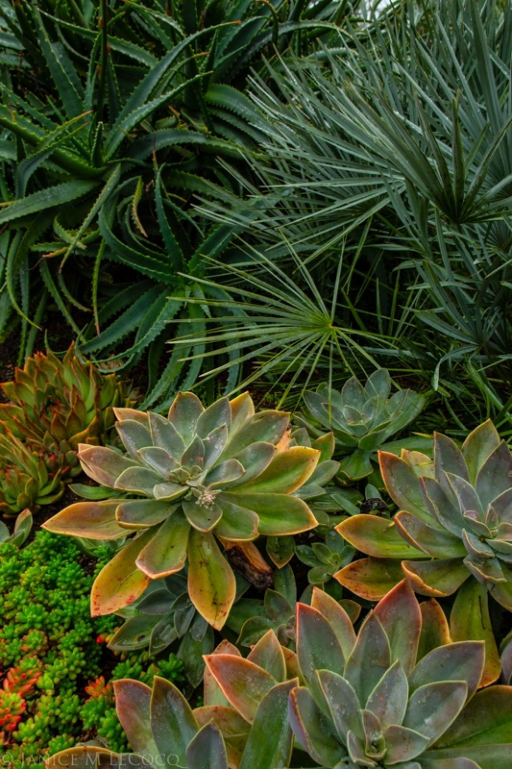 We also appreciate our workhorses: the plants that look lovely all year round, need little to no maintenance and don’t quickly outgrow their spaces, such as the Aloe arborescens, (zone 8), Chamerops humilus ‘Cerifera’ (zone 8), Graptoveria ‘Fred Ives’ (Zone 9) and Sedum rubrotinctum (Zone 9) pictured above. Cold weather doesn’t stop their display, rather, it adds more red highlights to the Sedum. Even if you are in a colder zone, you can plan for at least one part of your garden that looks good in all seasons.