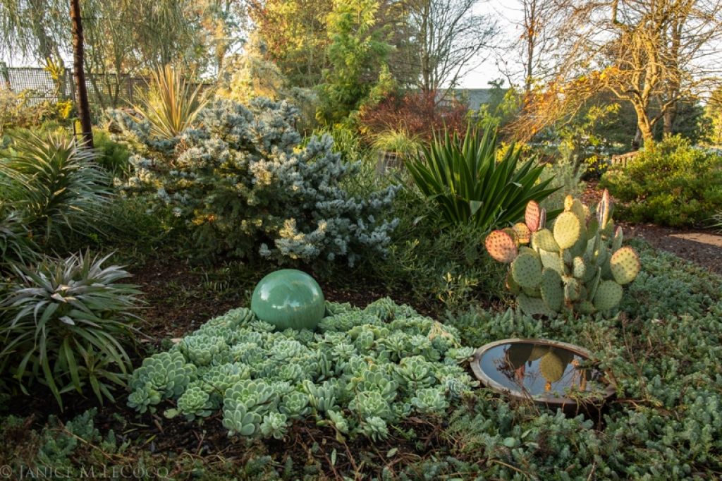 Some inanimate additions can pump up the color and texture, such as ceramics or water features. The celadon ball intensifies the Echeveria‘s (Zone 9) color and the water reflects the Opuntia santa-rita ‘Tubac’ (Zone 8) as it is touched by the morning sun.