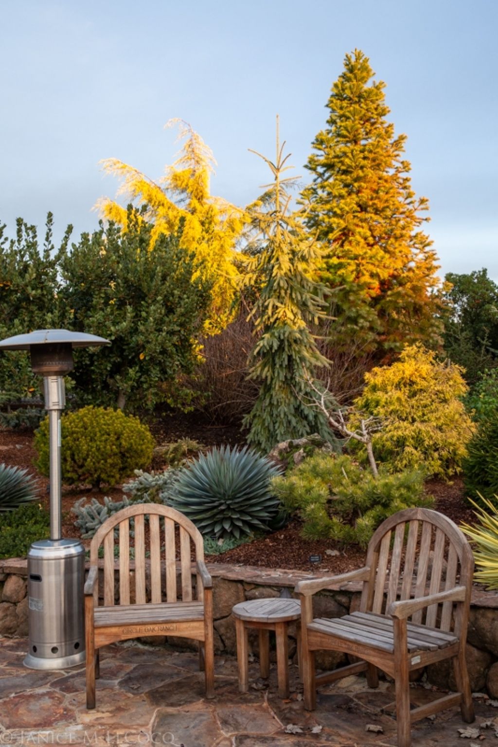 The yellow foliage, already a winter beacon, becomes downright fiery when hit by the late afternoon sun. Even the drabber colors, such as that of the tall Cunninghamia unicanaliculata (China fir, Zone 7) in the above photo, lights up like a torch.